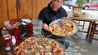 Finally, we rolled into Leadville, stopped immediately for a Gatorade and did the usual smart phone research. I decided not to chance my rear tire any further, so we needed a bike shop to do the work, followed by food. The local bike shop on the far south end of town got a new tire installed for me, set up tubeless, and the friendly folks there recommended a pizza place just down the street called High Mountain Pies. Man it was good! Rob and I got a 14" pizza apiece and proceeded to get to work: